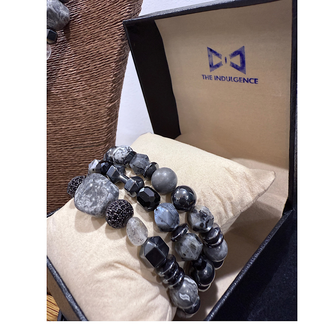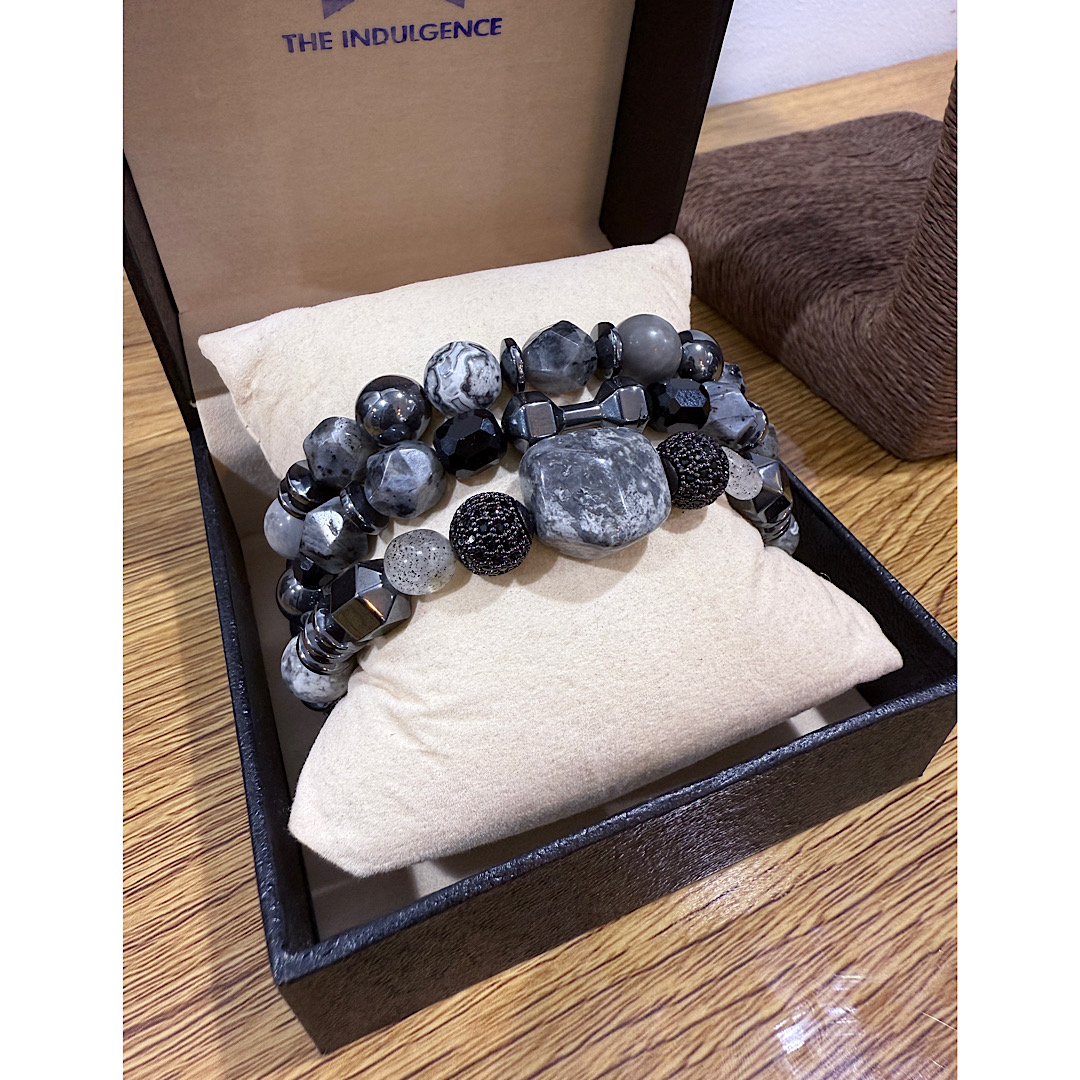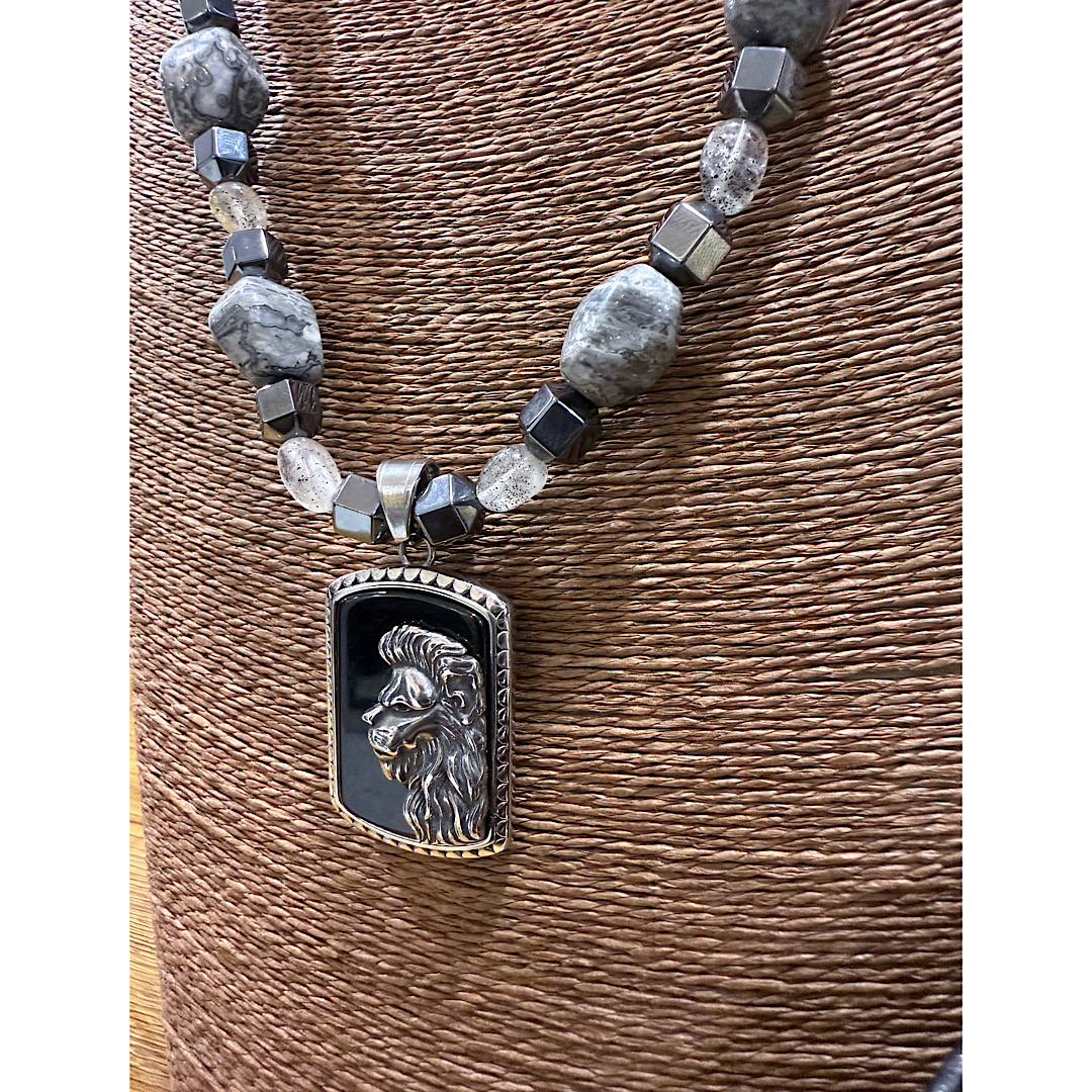 The Regal Mane Set – Natural Grey Jasper Neck Bead Bracelet Set reflects the essence of masculine poise and timeless royalty. Handcrafted by Master Artisans of Surulere under The Indulgence brand, this elegant design features Natural Grey Jasper stones paired with metallic accents and a bold lion-head pendant — a tribute to courage, leadership, and African prestige. Created for distinguished men who embody quiet power and refined taste.